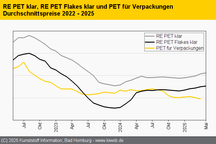 Die Neuwarenpreise werden deutlich sinken. Eine weitere Runde mit Aufschlägen bei den Rezyklatpreisen gilt deshalb im Panel als eher unwahrscheinlich. Anders bei PET und PET-Flakes: Da die Nachfrage hier weiter anziehen dürfte, werden Regranulierer weitere Aufschläge erwirken können. Dies berichtet der Branchendienst Kunststoff Information (KI, Bad Homburg) im aktuellen Online-Report.