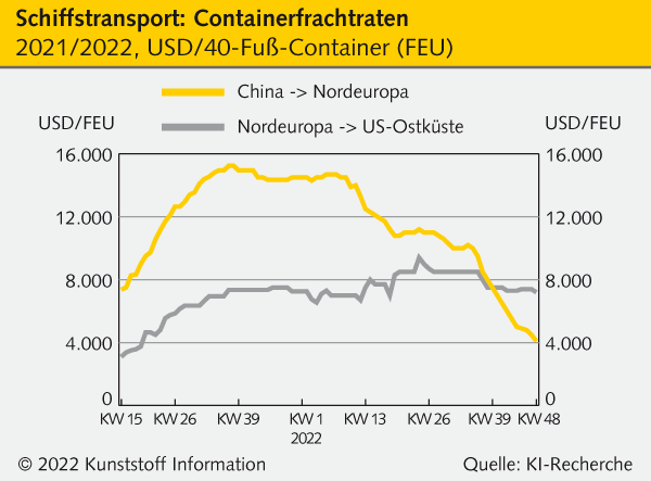 Doch nicht im Binnenverkehr stockt es. Auch an Gütern für den Schiffsverkehr mangelt’s. Das schlägt sich direkt in den Frachtraten für 40-Fuß-Container (FEU) nieder. Auf den Hauptstrecken von Asien nach Europa gingen die Preise um bis zu 16 Prozent in die Knie. Fast könnten einem die Logistikkonzerne Maersk & Co. leid tun.