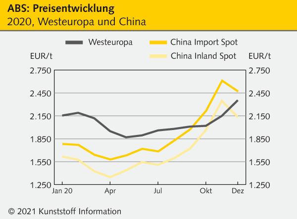Am ABS-Markt zeichnet sich eine Wende ab. Denn das Material, das in unterschiedlichen Branchen wie Haushaltsgeräte, Spielwaren und Konsumgüter, E&E, und Automotive zum Einsatz kommt, ist erstmals seit Monaten in Europa teurer als in China. Dies berichtet der Branchendienst Kunststoff Information (KI, Bad Homburg) im aktuellen Online-Report. Laut KI gaben die chinesischen Inland-Spotpreise im Dezember 2020 um 7,4 Prozent auf durchschnittlich 16.984 CNY (2.168 EUR/t) nach und die Import-Spotnotierungen um 3,7 Prozent auf 19.531 CNY. Angesichts des noch immer hohen Preisniveaus und der feiertagsbedingten Produktionsabstellungen zum chinesischen Neujahrsfest (12. Februar) sind weitere Rückgänge im Januar wahrscheinlich.