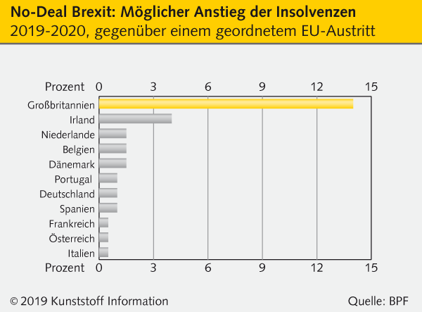 Demnach würde es bei einem „No Deal"-Brexit im Jahr 2020 in Großbritannien rund 14 Prozent mehr Konkurse geben als bei einem geregelten Ausscheiden aus der EU. Davon betroffen wären rund 2.300 Unternehmen. Bereits in diesem Jahr rechnet Atradius mit insgesamt 15.800 Insolvenzen in verschiedenen Sektoren auf der britischen Insel, was einem Anstieg von 4 Prozent gegenüber dem Vorjahr entsprechen würde. Auch das Forderungsrisiko in anderen EU-Ländern würde bei einem harten Brexit-Szenario steigen. Betroffen wäre insbesondere Irland, da die irische Wirtschaft 11 Prozent ihrer Exporte in das Nachbarland ausführt.