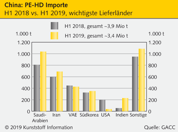 Als weltweit größter Verbraucher von Polyethylen mit stark steigender Nachfrage ist China trotz der massiven heimischen Produktionskapazitäten stark abhängig von Importen. Im ersten Halbjahr 2019 führte das Land über 8,3 Mio t PE ein, was einem Anstieg von 1,2 Mio t oder 17 Prozent gegenüber dem gleichen Zeitraum 2018 entspricht. Besonders stark stieg der Bedarf an PE-LLD. Die Importe lagen im Jahresvergleich 24 Prozent im Plus.