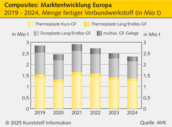 Auch im vergangenen Jahr 2024 hat die europäische Composites-Branche weniger Material verarbeitet als im Vorjahr: Die verarbeitete Gesamtmenge auf Basis thermoplastischer und duroplastischer Matrix schrumpfte um 5,9 Prozent auf nunmehr 2,35 Mio t. Das ist der dritte Rückgang in Folge. Immerhin: Damit scheint sich der Abstieg nach -9 respektive -8 Prozent in den beiden vorangegangenen Jahren zu verlangsamen. Composites mit Duroplast-Matrix büßten deutlicher ein als solche mit Thermoplast-Matrix. Während Duroplast-Teile um 8,4 Prozent auf 983.000 t verloren, gab die Produktion von Thermoplast-Composites nur um knapp 4 Prozent auf nun 1,37 Mio t nach, berichtete AVK-Geschäftsführer Dr. Elmar Witten im traditionellen Marktreport während der Weltleitmesse „JEC“ in Paris.