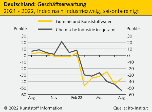 Und die Liste des Schreckens ließe sich fortschreiben: Die hohe Inflation drückt auf den Konsum. Die Angst vor einer Rezession wächst. „Es mehren sich die Anzeichen für eine Rezession der deutschen Wirtschaft im Sinne eines deutlichen, breit angelegten und länger anhaltenden Rückgangs der Wirtschaftsleistung“, hieß es jüngst seitens der Deutschen Bundesbank (Frankfurt). Dem entsprechend tauchten die Geschäftserwartungen der chemischen Industrie in Deutschland weiter ab, wie aus einer Umfrage des ifo Instituts (München) hervorgeht. Der entsprechende ifo-Index fiel im August noch einmal um 10 Zähler ab und lag bei nunmehr -54,5 Punkten im tiefroten Bereich.