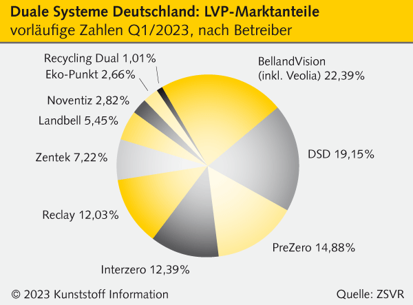 Den vorläufigen Daten der Zentralen Stelle Verpackungsregister (ZSVR, Osnabrück) für das erste Quartal 2023 zufolge hat BellandVision (Pegnitz) seinen Marktanteil in Deutschland weiter ausgebaut. Schon bisher war das Unternehmen, das seit dem vergangenen Jahr zum französischen Entsorger Veolia (Paris / Frankreich; www.veolia.com) gehört, die Nummer eins im Bereich der Lizenzierung von Leichtverpackungen (LVP-Fraktion). Im Vergleich zum Vorjahresquartal legte Belland nochmals um 1,7 Prozentpunkte zu.