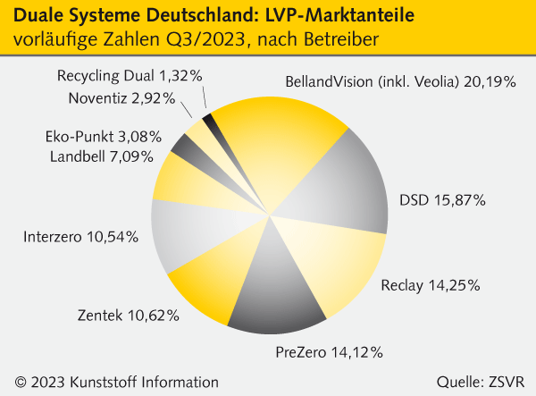 Den vorläufigen Daten der Zentralen Stelle Verpackungsregister (ZSVR, Osnabrück) für das dritte Quartal 2023 zufolge behaupten BellandVision (Pegnitz) und die Duale System Holding (DSD, Köln) weiterhin die Plätze 1 und 2 im Top-10-Ranking bei der Lizenzierung von Leichtverpackungen („LVP-Fraktion“) in Deutschland. Beide mussten im Vergleich zum ersten Quartal 2023 aber Marktanteile abgeben.