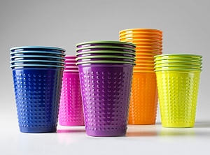 Schön knallig bunt -- aber wie lange noch? Becher aus Polystyrol (Foto: Flo)