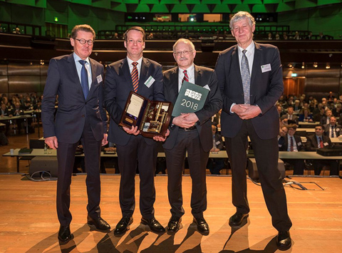 Vor den mit über 850 Teilnehmern sehr gut besuchten Kolloquiumsplenum übergab Dr. Herbert Müller , CEO von Surteco (D-86647 Buttenwiesen-Pfaffenhofen) und Vorsitzender der Fördervereinigung des IKV , den Preis stellvertretend an Dr. Erwin Baur , Intra-Vorstand sowie Gründer und Geschäftsführer der M-Base Engineering + Software GmbH (D-52068 Aachen).