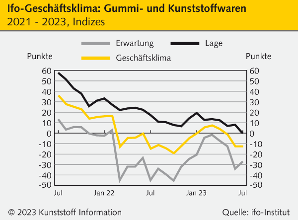 Den größten Rückgang verzeichnete das Verarbeitende Gewerbe: Der entsprechende Teilindex fiel um 4,5 Punkte auf -14,2 Zähler. Ein etwas anderes Bild zeigt derweil das Stimmungsbarometer für die Gummi- und Kunststoffindustrie. Der diesbezügliche Subindex des Verarbeitenden Gewerbes verharrte mit -14,7 Punkten auf dem Vormonatsniveau. Die Unternehmen beurteilten die aktuelle Geschäftslage zwar massiv schlechter (-8,3 Punkte auf -0,3 Zähler), blicken aber etwas weniger pessimistisch in die Zukunft (+6,9 Zähler auf -28 Zähler).