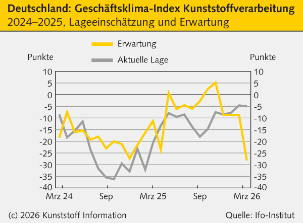 Die negativen Erwartungen spiegelten sich auch bei der Herstellung von Kunststoff- und Gummiwaren wider, einem Subsegment des Verarbeitenden Gewerbes. Hier erachteten die Unternehmen die aktuelle Lage im März nur geringfügig schlechter als im Vormonat, während die Aussichten so düster gesehen wurden wie zuletzt im Februar 2024. In der Summe von Lagebewertung und Erwartungen sackte das Geschäftsklima der Hersteller von Kunststoff- und Gummiwaren um -10,3 Zähler auf nun -17,0 Punkte.