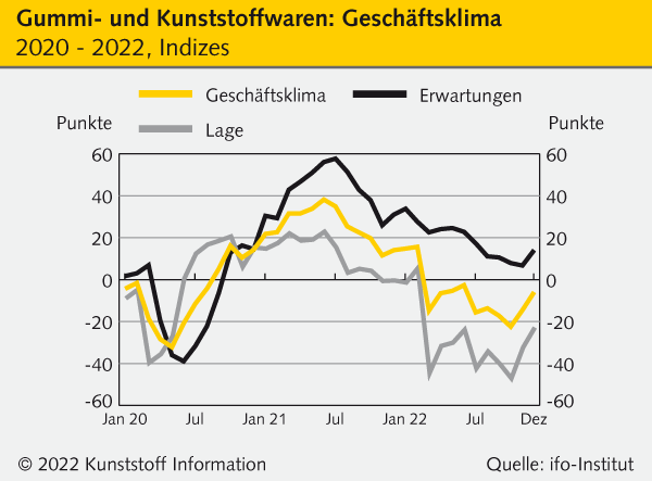 Am stärksten hellte die Stimmung im Handel und Verarbeitenden Gewerbe auf. Das ifo-Geschäftsklima für den Handel – in der Sektorenbetrachtung gilt der Wert „0“ als Grenze zwischen gut und schlecht laufender Konjunktur – kletterte zum Jahresende um 6,9 Punkte auf -20 Zähler, und im Verarbeitenden Gewerbe legte der Wert um 5,9 Zähler auf -5,6 Punkte zu. Bei den Gummi- und Kunststoffwaren als Unterbereich des Verarbeitenden Gewerbes war sogar ein Anstieg um 8,5 Zähler auf -6,3 Punkte zu beobachten.