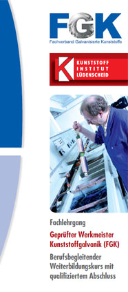 Aus diesem Grund hat der „Fachverband Galvanisierte Kunststoffe“ zusammen mit dem Kunststoff-Institut Lüdenscheid einen eigenen Fachlehrgang als berufsbegleitenden Weiterbildungskurs mit qualifiziertem Abschluss entwickelt und bietet diesen erstmalig ab September 2014 an.