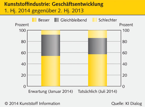 Die positiven Impulse für die gesamte deutschsprachige Kunststoffindustrie aus dem zweiten Halbjahr 2013 haben sich auch 2014 fortgesetzt. Die hohen Erwartungen der Unternehmen aus dem Januar wurden erfüllt: Mehr als die Hälfte der Branchenunternehmen konnten sich über eine Verbesserung des Geschäftsgangs freuen.