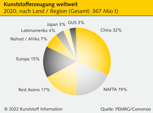Global gesehen, haben die europäischen Erzeuger – die für die EU-Zone genannten Daten beziehen sich laut Plastics Europe auf die 27 Mitgliedsländer sowie die Schweiz, Norwegen und Großbritannien („EU 27+3“) – damit einen Anteil von 15 Prozent an der weltweitweiten Produktion. Globaler Spitzenreiter in Sachen Kunststoffproduktion ist das Reich der Mitte: Chinas Anteil am Kuchen lag im Jahr 2020 bei 34 Prozent (nach 31 Prozent 2019).