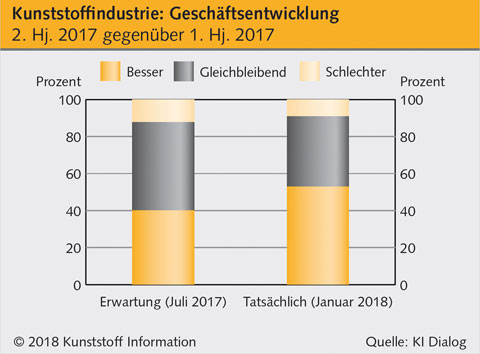 Dies berichtet der Branchendienst „KI – Kunststoff Information“ als Ergebnis seiner aktuellen Umfrage zur Kunststoffkonjunktur in der zweiten Jahreshälfte 2017, an der sich 527 Unternehmen beteiligt haben. KI befragt seit 2001 im halbjährlichen Rhythmus Führungskräfte der Kunststoffindustrie zu Geschäftsverlauf und -erwartung, Investitionen und Beschäftigung.