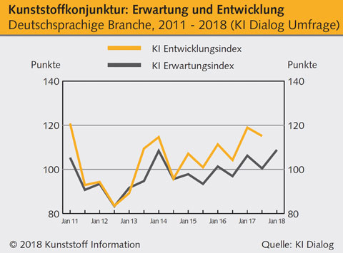 Seit gut drei Jahren kennt die deutschsprachige Kunststoffbranche eigentlich nur eine Richtung – anhaltend aufwärts. Auch im zweiten Halbjahr 2017 setzte sich diese Entwicklung fort. Die Mehrzahl der Branchen-Unternehmen verzeichnete eine nochmals verbesserte Geschäftsentwicklung im Vergleich zum ersten Halbjahr. Jobmotor und Investitionen laufen entsprechend auf Hochtouren. Ein Ende des Booms scheint derzeit nicht in Sicht.