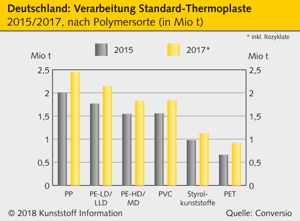 In Deutschland wurden im Jahr 2017 insgesamt rund 21,8 Mio t Kunststoffe produziert, davon 19,9 Mio t polymere Neuware und 1,9 Mio t Rezyklate. Für primäre Kunststoffwerkstoffe zur Verarbeitung im Inland ergibt sich nach Abzug von Klebstoffen, Lacken, Farben und Harzen sowie der Verrechnung von Import/Export-Bewegungen eine Menge von 11 Mio t. Das sind rund 8,5 Prozent mehr als zwei Jahre zuvor im Jahr 2015. Die deutschen Verarbeiter wandelten derweil insgesamt 14,4 Mio t Kunststoffwerkstoffe in Produkte um. Dabei entfielen 1,8 Mio t oder 12,3 Prozent auf Rezyklate. Bei den primären Polymerwerkstoffen ergibt sich mithin ein Importüberhang von mehr als 1,5 Mio t.