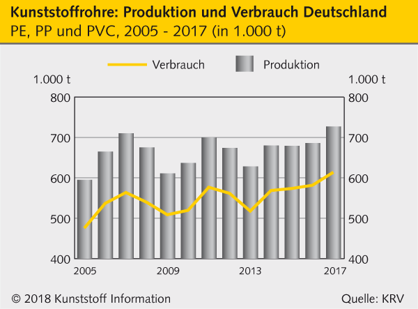 Die Hersteller von Kunststoffrohren haben dank der Nullzinspolitik der EZB und erhöhten Investitionen in die öffentliche Infrastruktur im vergangenen Jahr die Produktionsmenge auf einen Rekordwert gesteigert. Der Ausstoß von Rohrsystemen aus PE, PP, PVC-U und GFK stieg um 6,4 Prozent auf 794.541 t, wie der Kunststoffrohrverband in seinem aktuellen Jahresbericht mitteilt.
