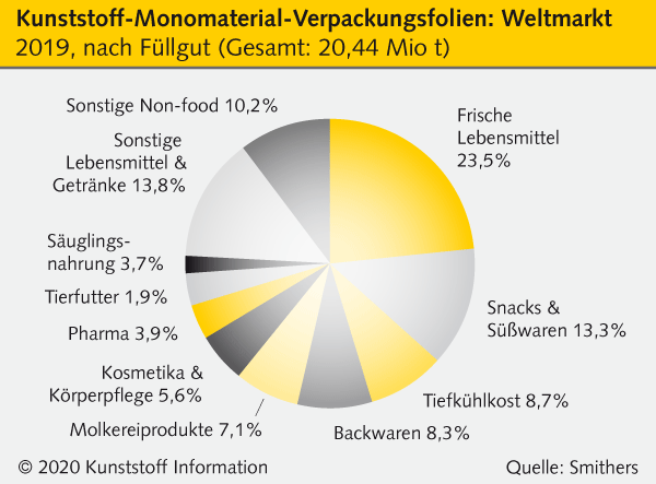 In dem aktuellen Report „The future of mono-material plastic packaging films to 2025" prognostizieren die Marktforscher, dass der weltweite Verbrauch in den kommenden fünf Jahren mit einer jährlichen Durchschnittsrate von 3,9 Prozent auf 26,03 Mio t und einen Wert von 70,9 Mrd USD (60 Mrd EUR) ansteigen wird. Dies wäre etwas höher als die durchschnittliche jährliche Wachstumsrate von 3,5 Prozent für den Zeitraum 2015 bis 2019, als die Nachfrage ein Volumen von 20,44 Mio t und einen Wert von 55,9 Mrd USD erreicht hat.