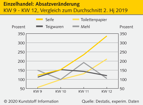Auswirkungen der seit Wochen andauernden Hamsterkäufe spüren unterdessen auch die Verpackungshersteller. So stieg etwa der Absatz an Fertigsuppen in der KW 10/2020 um 112 Prozent im Vergleich zur Vorwoche und in Folie verpackte Nudeln- und Teigwaren konnten um 73 Prozent zulegen.