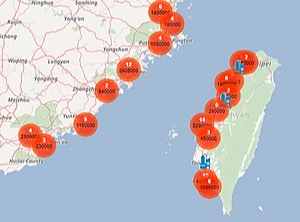 Bleibt zu hoffen, dass Sturm "Doksuri" die Landkarte der petrochemischen Anlagen zwischen Taiwan und China nicht kräftig durcheinander wirbelt (Abb: Polyglobe/OpenStreetMap)