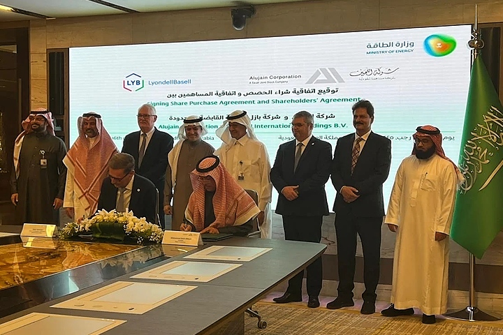 Vertragsunterzeichnung vor arabischer Kulisse: LYB-CEO Peter Vanacker und Alujain-Chef Mohammed Bin Saleh Al Khalil (sitzend, von links, Foto: LyondellBasell)