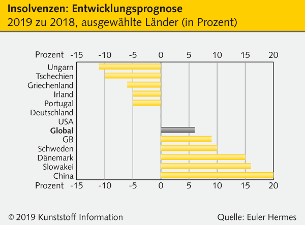 Die weltweit schwächelnde Konjunktur und schwierigere Finanzierungsbedingungen sind zentrale Gründe für die in diesem Jahr erwartete Zunahme der Firmeninsolvenzen rund um den Globus. Die Exportrisiken verschärfen sich deutlich: In zwei von drei Ländern nehmen die Pleiten 2019 zu. Große Ausnahmen sind die USA, Deutschland, die Benelux-Staaten, Südkorea und Taiwan, wo das Insolvenzniveau den Prognosen des Finanzdienstleisters Euler Hermes (EH,) zufolge in 2019 unverändert bleiben wird. In acht Ländern weltweit soll die Anzahl zahlungsunfähiger Unternehmen sogar zurückgehen.