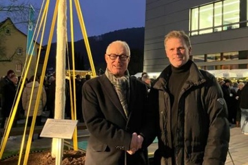 Dr. Harald Marquardt (li.) und Björn Twiehaus bei der Stabsübergabe: Ersterer erhielt als Abschiedsgeschenk von der Belegschaft eine Eiche als Symbol für sein langjähriges Wirken (Foto: Marquardt)