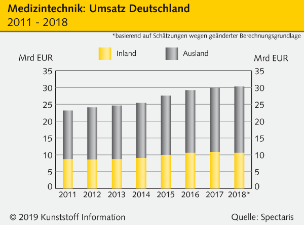 Im Jahr 2018 erzielten die deutschen Medizintechnikhersteller laut Statistischem Bundesamt (destatis,) einen Umsatz von 30,28 Mrd EUR, ein neuer Rekord. Dies meldet der Industrieverband Spectaris (Berlin). Im Vorjahr lag dieser Wert noch bei 29,9 Mrd EUR. Allerdings lassen sich beide Werte aufgrund einer geänderten Berechnungsgrundlage nur grob vergleichen. So könnte das Branchenwachstum ebenfalls aus dieser Änderung resultieren. Spectaris geht aber davon aus, dass der Gesamtumsatz um 2 bis 3 Prozent gestiegen ist.