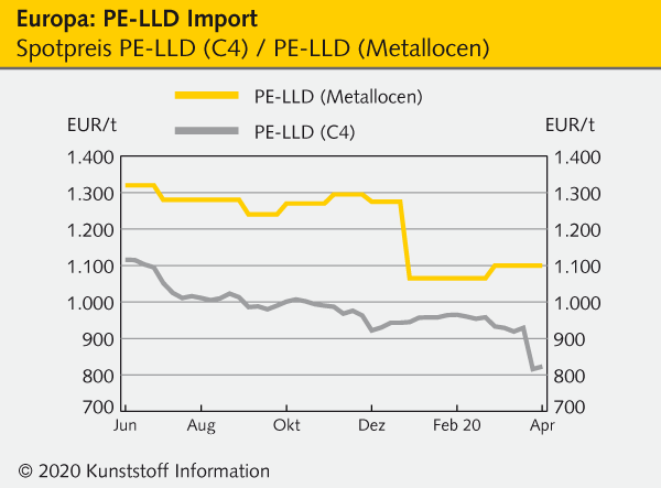 Zeitgleich zu der Verdreifachung der früheren Importmenge aus den USA – die bei rund 35.000 t monatlich über ein Jahr hochgerechnet etwa den Umfang eines weiteren europäischen Produzenten annehmen kann – ist ein grundsätzlicher Preiskampf in Europa zu beobachten. Die Notierungen der C6/Metallocen-Typen aus den USA, die im direkten Wettbewerb zu den hiesigen C6- und C8-Typen stehen und die von Shale Gas-Rohstoffen und metallocenbasierten Katalysatoren doppelt begünstigt sind, sanken deutlich. Sabic als dem wesentlichen arabischen PE-LLD (C4)-Produzenten blieb wenig übrig, als zumindest im Spothandel nach unten auszuweichen.