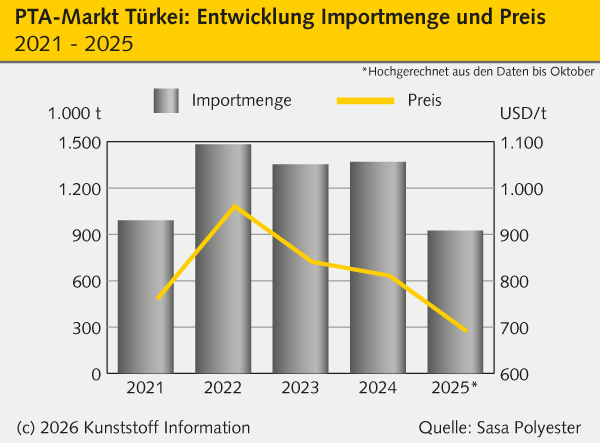 Auf Antrag des einzigen türkischen Erzeugers von PTA – Sasa Polyester Sanayi (Adana / Türkei) – hat die türkische Wettbewerbsbehörde zu Jahresbeginn 2026 begonnen, die Importentwicklung des PET-Vorprodukts zu untersuchen. Hauptlieferland ist Südkorea mit einem Anteil von mehr als der Hälfte, hinzu kommen China und Belgien. Das Unternehmen fordert von der türkischen Regierung die Einführung von Schutzmaßnahmen.