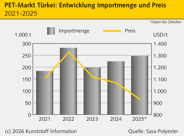 Beinahe zeitgleich zur Untersuchung der PTA-Importe hat die Türkei am 31. Dezember 2025 auch mit Ermittlungen zu den – zuletzt deutlich gestiegenen – Einfuhren von PET begonnen. Anders als bei dem Vorprodukt verhängte das Handelsministerium für das Polymer in Abstimmung mit der WTO jedoch direkt vorläufige Zölle auf alle Herkunftsländer in Höhe von 100 USD/t (86 EUR/t). Diese gelten zunächst für maximal 200 Tage. Auch in diesem Fall initiierte Sasa Polyester Sanayi (Adana / Türkei) die Befassung der Wettbewerbsbehörde mit dem Fall.