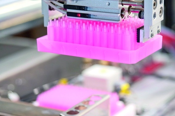 Die Fertigung erfolgt in Räumen der Schutzklasse DIN EN ISO 14644-1 Klasse 7 sowie gemäß GMP-Standards. Spritzgegossene Bauteile werden dabei vollautomatisiert gefertigt: Roboter entnehmen die Teile aus dem Werkzeug, fahrerlose Transportsysteme (FTS) bringen sie anschließend selbstständig zu den Verpackungseinheiten.