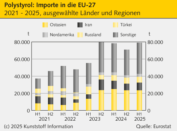 Die Menge an Polystyrol, das in die EU-27 eingeführt wurde, legte im vergangenen Jahr laut Eurostat-Daten um 9,3 Prozent zu auf rund 149.420 t. Seit 2021 – dem Jahr nach der Corona-Pandemie – haben sich die Einfuhrmengen bis 2024 mehr als verdoppelt. Der Anstieg der Importe ist aber keinesfalls ein Anzeichen für ein Wachstum des Polystyrol-Markts in Europa. Vielmehr dürften die Einfuhren den hiesigen PS-Erzeugern im Wege stehen, die Produktion wieder etwas nach oben zu fahren. Denn seit dem zweiten Halbjahr 2022 haben europäische Erzeuger die Produktion massiv gedrosselt – zunächst wegen der hohen Energie- und Rohstoffkosten, dann wegen der extrem dünnen Nachfrage.