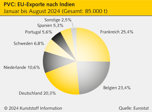 Europa lieferte in den vergangenen Jahren relativ stabil an die 100.000 t PVC nach Indien, gelegentlich auch etwas mehr. Die wesentlichen EU-Exporteure sind, wenig überraschend, Deutschland, Belgien, Niederlande und Frankreich.