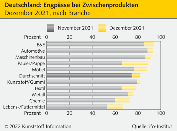 Mehr als vier Fünftel der deutschen produzierenden Unternehmen hatten im Dezember 2021 Schwierigkeiten, sich Vorprodukte und Rohstoffe zu beschaffen. Das ist das Ergebnis der monatlichen Umfrage des ifo-Instituts (München). Mit 81,9 Prozent habe sich die Situation im letzten Monat des Jahres noch einmal deutlich verschärft, teilten die Konjunkturforscher mit. Bei der November-Erhebung hatte der Wert noch bei „nur“ 74,4 Prozent gelegen.