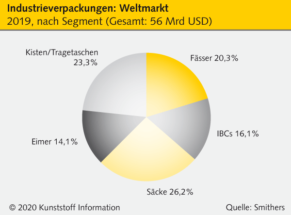 Unter den Abnahmesektoren der Industrieverpackungen rangiert die Chemie- und Pharmabranche mit einem Anteil von 34 Prozent im Jahr 2019 ganz vorne. Nimmt man die verwandten Bereiche Kunststoffe & Gummi sowie Öl & Schmiermittel hinzu, wächst der Anteil am Gesamtkuchen auf fast die Hälfte. Der Rest entfällt auf Lebensmittel & Getränke, Bau und andere Bereiche.