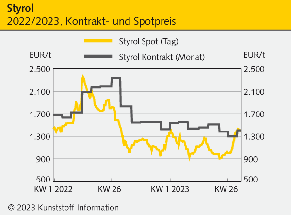 Erste Anzeichen dafür gaben die KI-Panelgespräche zum Trendreport August, bei denen einige Abnehmer von Preisangeboten berichteten, deren Aufschläge erheblich über denen des Styrol-Kontrakts lagen. Der Kontrakt für das Vorprodukt war zuvor um 108 EUR/t höher bei 1.405 EUR/t fixiert worden. Bereits jetzt gibt es einige EPS-Anbieter, die wegen des Styrolmangels nicht alle ihre Kunden vollständig bedienen können und auf Geschäft verzichten müssen. Sollte der Spotpreis im September noch zulegen, dann wird es zu weiteren spürbaren Ausschlägen bei EPS kommen. Eine solche Entwicklung gilt bei erstarkender Nachfrage als wahrscheinliches Szenario.