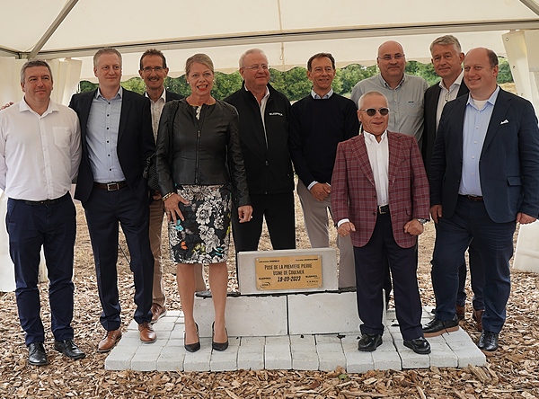 Grundsteinlegung in Coulmer, u.a. mit Medica-Geschäftsführer Thomas Freis (2.v.li.); Carolin Grimbacher (Geschäftsführende Gesellschafterin von Südpack), Erik Bouts (6. v.li.; CEO Südpack) und Johannes Remmele (Inhaber Südpack, 4.v.li.).