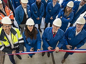 Feierliche Eröffnung in Terneuzen: Die Trinseo-Manager Pascal Lakeman (li., F&E), Francesca Reverberi (Nachhaltigkeit) und Han Hendriks (re., Technologie) mit Jo-Annes de Bat, einem Vertreter der regionalen Politik (Foto: Trinseo / Business Wire)