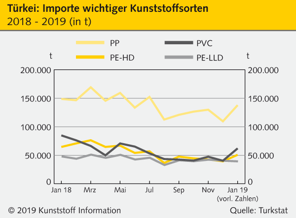 Die wieder etwas festere Währung brachte auch etwas Schwung ins Importgeschäft. Zwar haben die PE-HD-Importe noch längst nicht wieder das Niveau vom ersten Halbjahr 2018 erreicht, gegenüber dem Tief im August sind sie aber um knapp 40 Prozent gestiegen. Auch die Importnachfrage nach PE-LLD und PP steigt wieder, wie aus vorläufigen Turkstat-Daten für den Januar 2019 hervorgeht.