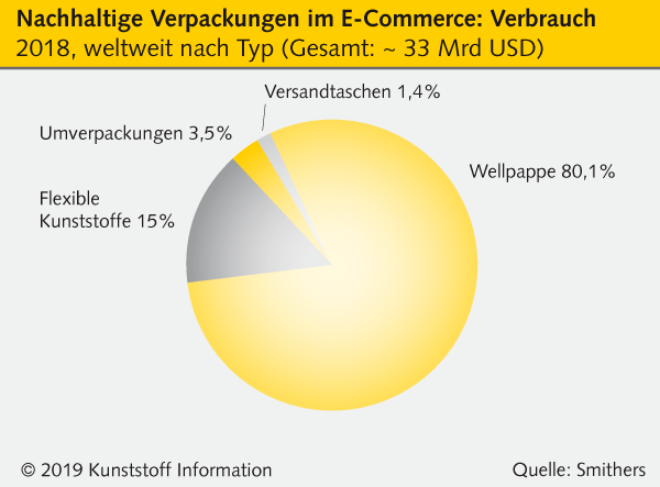 Der E-Commerce entwickelt sich stark mit einem jährlichen Wachstum von durchschnittlich knapp über 20 Prozent. Der globale Markt für E-Commerce-Verpackungen, einschließlich Wellpappen-, Weich-, Schutz- und Transportverpackungen, hat heute einen Wert von rund 35 Mrd USD (31,4 Mrd EUR), heißt es in dem Marktbericht „The Impact of E-Commerce on Packaging": Long-term Forecasts to 2029".