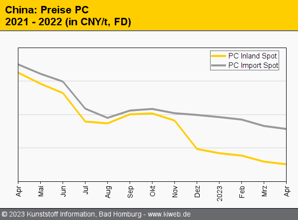 Die Preise für die technischen Thermoplaste auf dem chinesischen Markt gingen im April mehrheitlich zurück, da die Nachfrage weiterhin enttäuschte. Die Produktion von ABS und Polycarbonat wurde im April weiter hochgefahren, was die Spotpreise nach unten drückte. Dagegen sank die Auslastung der PMMA- und PBT-Anlagen im Vergleich zum Vormonat, was die Spotpreise nach oben trieb.