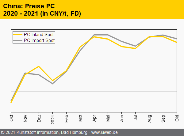 Die Preise für technische Thermoplaste auf dem chinesischen Markt präsentierten sich im Oktober 2021 uneinheitlich. Die meisten Produzenten waren von Stromeinsparungsmaßnahmen des Landes („Dual Control Policy“) nicht sonderlich stark betroffen. Gleiches gilt für die verarbeitenden Unternehmen, da viele dieser Anlagen außerhalb der großen Industriecluster liegen und vergleichsweise wenig Energie verbrauchen. Der überdurchschnittlich starke Anstieg des Kohlepreises, auf den die chinesische Regierung seit Ende Oktober mit einer Deckelung reagiert, hatte auf die Aromaten nicht den gleichen starken Einfluss wie auf die Olefine – dennoch trieben die gestiegenen Kosten für Erdgas, Kohle und Rohöl in der ersten Oktoberhälfte einige Vorproduktpreise durchaus etwas in die Höhe. Zudem belebte sich die Nachfrage nach der Feiertagswoche (Goldene Woche vom 1. bis 7. Oktober) wieder. Dies berichtet der Branchendienst Kunststoff Information (KI, Bad Homburg) im aktuellen Online-Report.