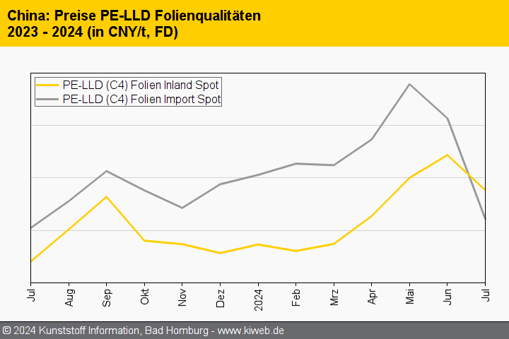 Die monatlichen Durchschnittspreise der meisten berichteten Standard-Thermoplaste auf dem chinesischen Markt gingen im Juli 2024 zurück. Einzige Ausnahme war PET. Der Rückgang der Notierungen war vor allem auf eine geringe bis stagnierende Nachfrage, hohe Lagerbestände und einen Rückgang der Rohölpreise zurückzuführen. Im Gegensatz dazu stiegen die PET-Preise vor allem aufgrund der starken Nachfrage aus der Getränkeindustrie und eines Angebots, das unter den Erwartungen lag. Dies berichtet der Branchendienst Kunststoff Information (KI, Bad Homburg) im aktuellen Online-Report.