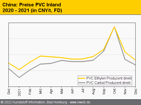 Die Preise auf dem chinesischen Markt für Standard-Thermoplaste haben im Dezember 2021 mit wenigen Ausnahmen teils deutlich nachgegeben. Lediglich die Notierungen für PET- sowie für PE-HD-Extrusionssorten auf dem Importmarkt stiegen angesichts der knappen Verfügbarkeit. Alle anderen Polymere zeigten sich gut versorgt bei geringer Nachfrage. PVC und PS gaben besonders stark nach, die Rückgänge bei PE-LD, PE-LLD, den übrigen PE-HD-Typen und Polypropylen waren indes weniger ausgeprägt. Dazu trugen auch die breitflächig gesunkenen Vorproduktpreise bei.