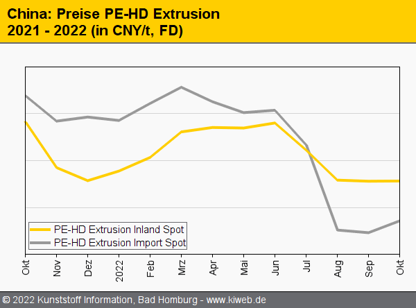 Die Notierungen für Standard-Thermoplaste in China entwickelten sich im Oktober uneinheitlich. Während die Durchschnittspreise für PE-LD, PVC, Polystyrol und PET aufgrund hoher Lagerbestände, schwacher Nachfrage und gesunkener Rohstoffkosten einen Abwärtstrend zeigten, zogen die Preise für PE-LLD, PE-HD und Polypropylen bei besserer Ordertätigkeit leicht an. Dies berichtet der Branchendienst Kunststoff Information (KI, Bad Homburg) im aktuellen Online-Report.