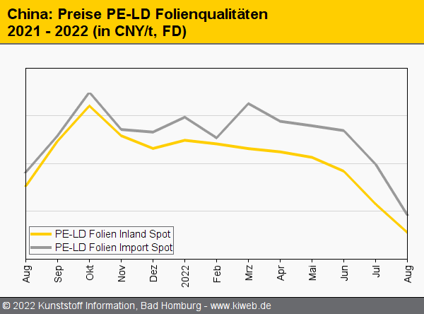 Die Durchschnittspreise der meisten Standard-Thermoplaste auf dem chinesischen Markt sind im August gesunken. Historisch hohe Temperaturen drückten die ohnehin geringe Nachfrage noch weiter nach unten. PET war im August der einzige Standard-Kunststoff, der aufgrund einer Angebotsverknappung einen Preisanstieg verzeichnete. Dies berichtet der Branchendienst Kunststoff Information (KI, Bad Homburg) im aktuellen Online-Report.