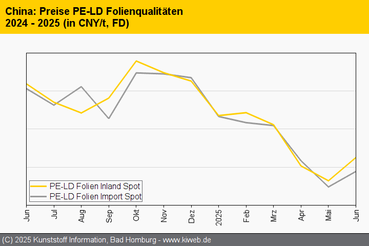 Im Juni 2025 bewegten sich die Durchschnittspreise für die meisten Standard-Thermoplaste auf dem chinesischen Markt seitwärts. Ausnahmen bildete zum einen PE-LD, das wegen knapper Versorgungslage und steigender Rohölpreise höher fixiert wurde, auf der anderen Seite PET, das wegen der saisonbedingt höheren Nachfrage fester tendierte. Insgesamt war die Seitwärtsbewegung das Ergebnis schwacher Nachfrage aus den Abnehmerbranchen, die von höheren Rohöl- und Vorproduktkosten nach der Eskalation des Iran-Israel-Konflikts Mitte Juni zunächst konterkariert wurde. Gegen Monatsende gaben die Polymerpreise aufgrund des sehr geringen Kaufinteresses jedoch wieder nach.