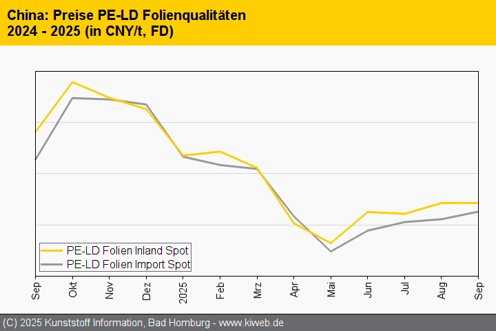 Die monatlichen Durchschnittspreise der meisten Standardkunststoffe auf dem chinesischen Markt gaben im September weiter nach. Ausnahmen waren PE-LD- und PE-LLD-Folientypen, die sich minimal verteuerten. Die Nachfrage enttäuschte durch die Bank, trotz Hochsaison in einigen verarbeitenden Sektoren. Gleichzeitig war die Verfügbarkeit von Material aus inländischer Produktion sowie auf dem Importmarkt gut. Bei Polystyrol und PET spielte zudem der Rückgang der Vorproduktpreise eine entscheidende Rolle für die Preisabschläge.