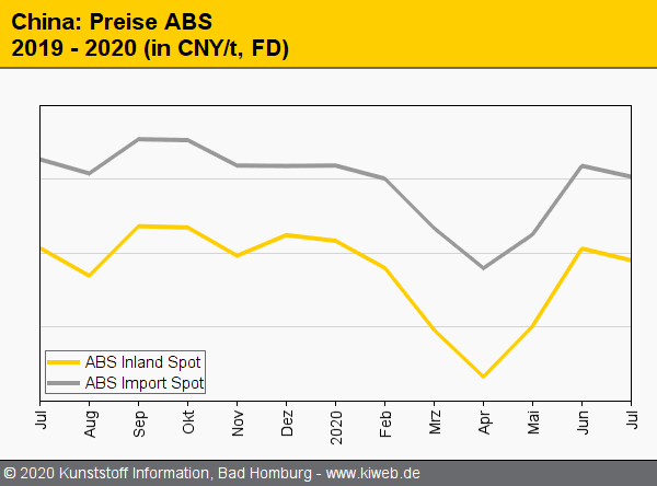 Mit Ausnahme von POM sanken die Preise für technische Thermoplaste am chinesischen Markt im Juli 2020. Die Preise für ABS, PA 6, PA 6.6 und PBT fielen angesichts der Sommerflaute, besonders stark betroffen war der Preis für PMMA – bedingt durch die saisonal geringe Nachfrage.